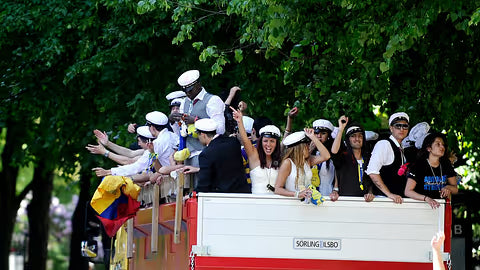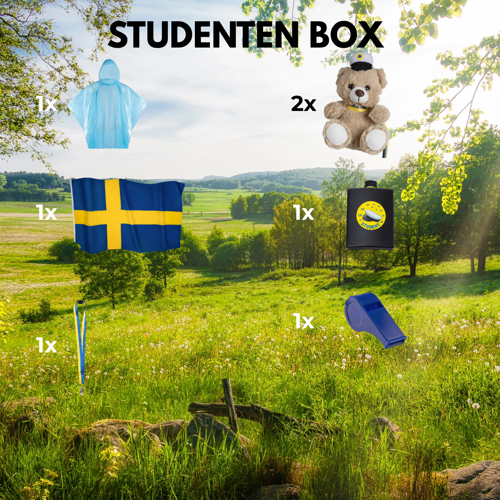 En svensk flagga, en extra landflagga (om vald), blågult studenthalsband, visselpipa, två fluffdjur, regnponcho, svart studentplunta och klistermärken.